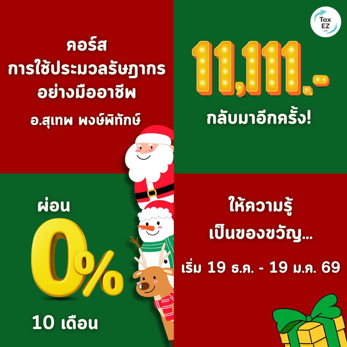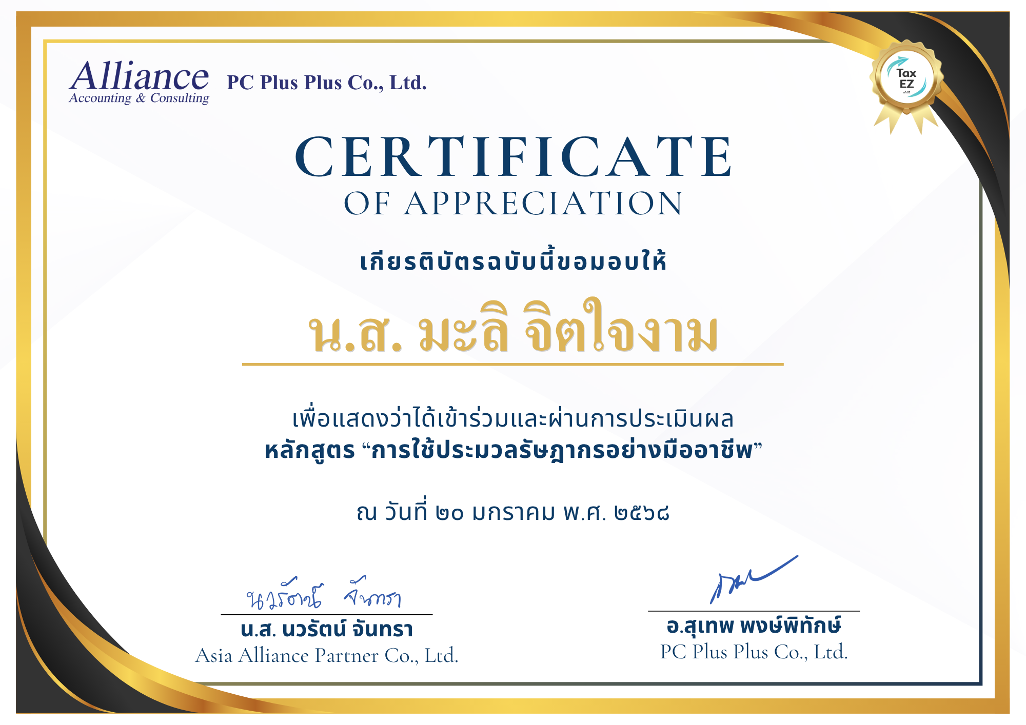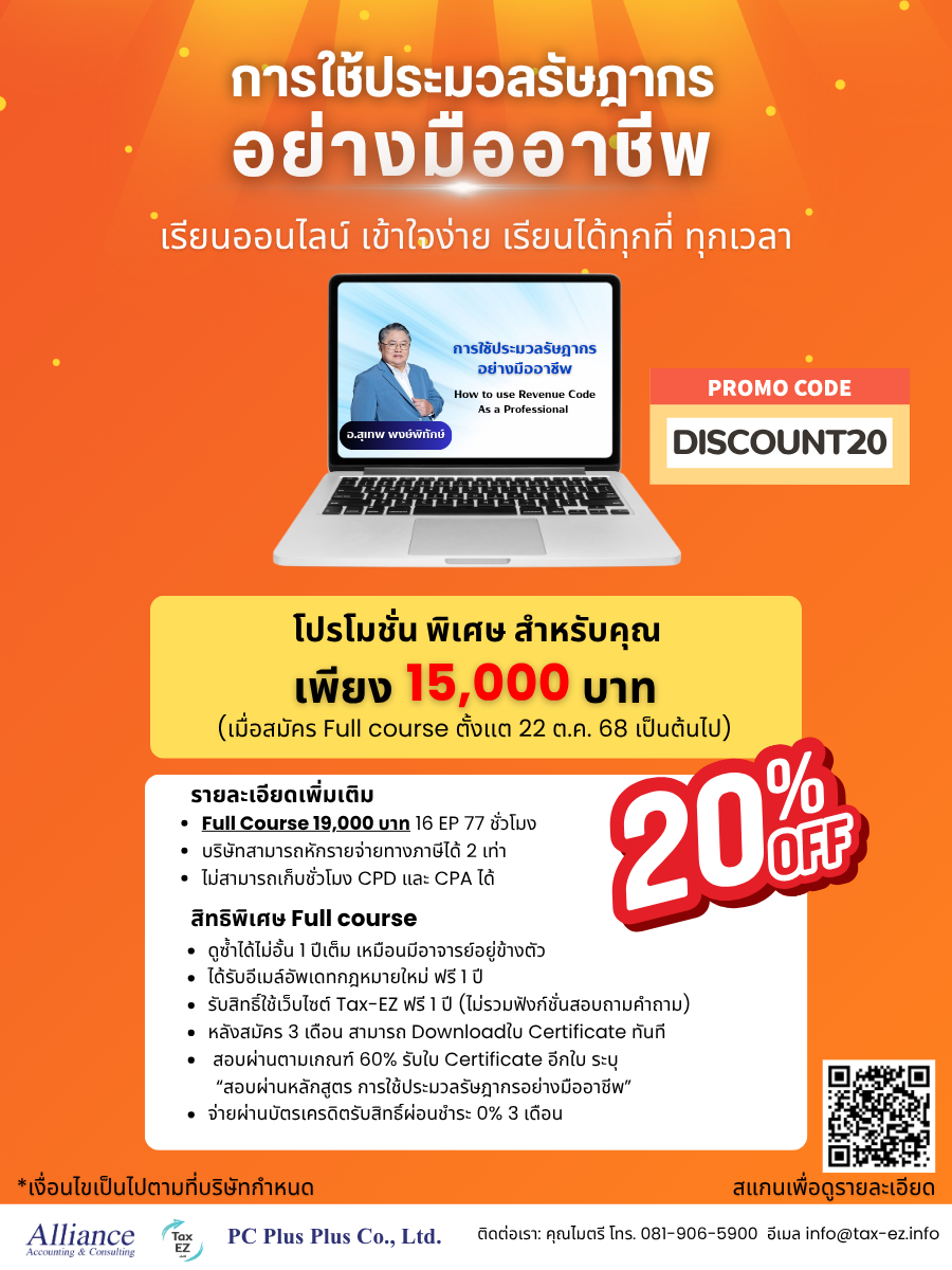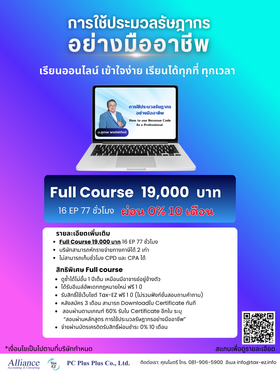 ค่าลงทะเบียน? ☑️ เรียนแยก EP. ได้ในราคา 1,200 บาท/EP หรือ ⏰ พิเศษ!! สมัคร Full Course จากราคาปกติ 19,000 บาท ✨✨เหลือเพียง 13,000 บาท (รวมภาษีมูลค่าเพิ่ม) เพียงใส่ "Promo Code"✨✨คุ้มค่าแค่ไหน? ☑️ เฉลี่ย ชั่วโมงละ 168 บาท (เทียบเท่ากาแฟหนึ่งแก้ว.... แต่เปลี่ยนชีวิตการทำงานทั้งระบบ) ☑️ หรือแค่ นาทีละ 2.80 บาท เท่านั้น !!! ☑️ เฉลี่ย วันละ 35 บาท | สนใจสมัคร ต้องทำอย่างไร? ✅ สมัครง่ายมาก! ผ่านเว็บไซต์ TAX-EZ ได้เลย สิทธิพิเศษเมื่อสมัคร Full Course ✅ ได้รับ E-mail อัปเดตกฎหมายใหม่ ทางอีเมล ฟรี! 1 ปี ✅ ผ่อนชำระ 0% นาน 3 เดือน เมื่อชำระผ่านบัตรเครดิต ✨ สมัครครั้งเดียว ได้ครบทั้งความรู้และใบรับรอง คุ้มแบบมืออาชีพ ต้อง TAX-EZ เท่านั้น! |