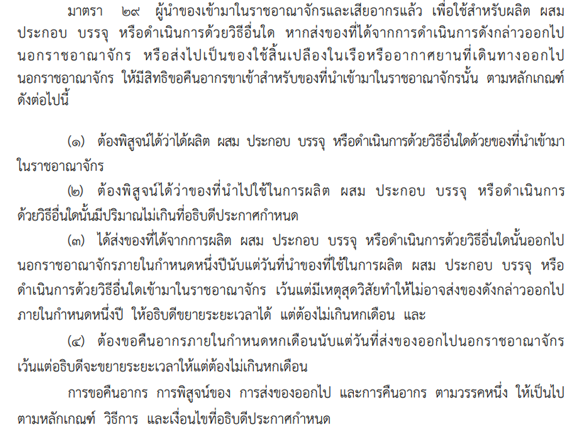 | คำตอบ | กรณีบริษัทฯ ต้องการขอคืนอากรจากวัตถุดิบที่นำเข้ามาเพื่อผลิตส่งออก สามารถขอคืนอากรกับกรมศุลกากรได้ โดยของที่ได้รับคืนอากรตามมาตรา 29 มีรายละเอียดที่กำหนดไว้ตามด้านล่างค่ะ 1. วัตถุดิบที่เห็นได้ชัดเจนว่ามีอยู่ในของที่ผลิตเพื่อส่งออก 2. วัตถุดิบที่ใช้การผลิตโดยตรงที่มีอยู่ในของที่ผลิตเพื่อส่งออก 3. วัตถุดิบจำเป็นที่ใช้ในการผลิต ขั้นตอนการขอคืนอากรวัตถุดิบที่นำเข้ามาผลิตเพื่อการส่งออกตามมาตรา 29 1. ผู้นำของเข้า ขออนุมัติหลักการคืนอากรตามมาตรา 29 และขอเลขทะเบียนสิทธิประโยชน์ทางภาษีอากร 2. ผู้ส่งออก จะต้องขอเลขทะเบียนสิทธิประโยชน์ทางภาษีอากร สำหรับการคืนอากรตามมาตรา 29 3. การนำของเข้า 4. การยื่นสูตรการผลิต 5. การยื่นตารางโอนสิทธิ์ 6. การส่งของออก 7. การยื่นคำร้องขอคืนอากร 8. การชำระค่าภาษีอากรวัตถุดิบคงเหลือ อ้างอิง :
