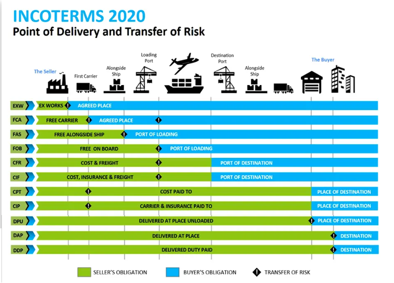 การนำเข้าสินค้าจากต่างประเทศ โดยขนส่งสินค้าโดยเรีอเดินทะเล หรือโดยอากาศยาน นั้น มีข้อกำหนดมาตรฐานในการส่งมอบสินค้า หรือมาตรฐานเงื่อนไขการส่งมอบสินค้าทั้งหมด 11 ซึ่งออกโดยสภาหอการค้านานาชาติ (ICC: International Chamber of Commerce) เพื่อกำหนดหน้าที่ของผู้ขายและผู้ซื้อในการทำธุรกิจซื้อขายสินค้าระหว่างประเทศ เรียกว่า INCOTERMs ดังนี้ – EXW (Ex Works) ผู้ขายจะสิ้นสุดภาระการส่งมอบสินค้า เมื่อผู้ขายได้เตรียมสินค้าไว้พร้อมสำหรับส่งมอบให้กับผู้ซื้อ ณ สถานที่ของผู้ขายเอง โดยผู้ซื้อจะต้องรับผิดชอบค่าใช้จ่ายต่าง ๆ ในการขนส่งสินค้า ไปยังคลังสินค้าของผู้ซื้อเอง – FCA (Free Carrier) ผู้ขายจะสิ้นสุดภาระการส่งมอบสินค้า เมื่อผู้ขายได้ส่งมอบสินค้าให้กับผู้รับขนส่งที่ระบุโดยผู้ซื้อ ณ สถานที่ของผู้รับขนส่ง ที่ผู้ขายต้องทำพิธีการส่งออกรับผิดชอบค่าใช้จ่ายในการขนส่งสินค้า และความเสี่ยงภัยระหว่างการขนส่งจากสถานที่ของผู้ขาย จนกระทั่งถึงสถานที่ของผู้รับขนส่ง ส่วนค่าใช้จ่ายต่าง ๆ ในการขนสินค้าและความเสี่ยงภัยต่าง ๆ ไปยังจุดหมายปลายทางเป็นของผู้ซื้อ – CPT (Carriage Paid To) ผู้ขายจะสิ้นสุดภาระการส่งมอบสินค้า เมื่อผู้ขายได้ส่งมอบสินค้าให้ผู้รับขนส่งที่ระบุโดยผู้ซื้อ ณ สถานที่ของผู้รับขนส่งสินค้าที่เมืองท่าต้นทาง ผู้ขายเป็นผู้รับผิดชอบในการ ทำพิธีการส่งออก และจ่ายค่าระวางขนส่งสินค้าส่วนค่าใช้จ่ายอื่น ๆ รวมทั้งความเสี่ยงภัย ในการขนส่งเป็นภาระของผู้ซื้อในทันทีที่สินค้าถูกส่งมอบให้แก่ผู้รับขนส่งสินค้าที่เมืองท่าต้นทาง – CIP (Carriage and Insurance Paid To) ผู้ขายจะสิ้นสุดภาระการส่งมอบสินค้า เมื่อผู้ขายได้ส่งมอบสินค้า ให้ผู้รับขนส่งที่ระบุโดยผู้ซื้อ ณ สถานที่ของผู้รับขนส่งสินค้าที่เมืองท่าต้นทาง ผู้ขายเป็นผู้รับผิดชอบในการทำพิธีการส่งออก จ่ายค่าระวาง ขนส่งสินค้า และค่าประกันภัยขนส่งสินค้า เพื่อคุ้มครองความเสี่ยงภัยในการขนส่งสินค้าจนถึงมือผู้ซื้อให้แก่ผู้ซื้อด้วย – DAP (Delivered at Place) ผู้ขายจะต้องรับผิดชอบในค่าใช้จ่ายต่างๆ ยกเว้นค่าภาษีและพิธีการนำเข้า และต้องรับความเสี่ยงภัยจนสินค้าถึงจุดหมายปลายทาง – DPU (Delivered at Place Unloaded) ผู้ขายทำการส่งมอบสินค้า โดยรับผิดชอบทั้งค่าใช้จ่าย และความเสี่ยงทั้งหมดไปจนถึงการขนถ่ายสินค้าลงจากยานพาหนะไปยังอาคารขนถ่ายสินค้าปลายทางที่ระบุในสัญญารับขนส่ง โดยที่ผู้ซื้อรับความเสี่ยงทั้งหมดของสินค้าเมื่อได้รับมอบสินค้าแล้ว – DDP (Delivered Duty Paid) เงื่อนไข การส่งมอบนี้ ผู้ขายจะสิ้นสุดภาระการส่งมอบสินค้า เมื่อผู้ขายได้จัดให้สินค้าพร้อมส่งมอบ ณ สถานที่ปลายทา