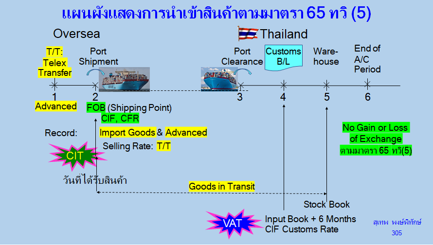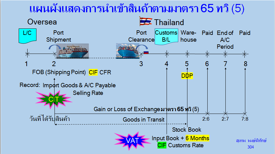 ต่อข้อถาม ขอเรียนว่า กรณีบริษัทฯ นำเข้าสินค้าจากต่างประเทศ เพื่อการผลิตสินค้า ในการตั้งเจ้าหนี้การค้า นั้น ให้พิจารณาเงื่อนไขในการส่งและรับมอบสินค้า ตาม INCOTERMs ดังกล่าวเป็นสำคัญ อาทิ เงื่อนไข CIF (Cost Insurance and Freight) ผู้ขายจะสิ้นสุดภาระการส่งมอบสินค้า เมื่อผู้ขายได้ส่งมอบสินค้าข้ามกาบเรือขึ้นไปบนเรือสินค้า ผู้ขายเป็นผู้รับผิดชอบในการทำพิธีการส่งออก จ่ายค่าระวางเรือ และค่าประกันภัยขนส่งสินค้า เพื่อคุ้มครองความเสี่ยงภัยในการขนส่งสินค้าจนถึงมือผู้ซื้อให้แก่ผู้ซื้อด้วย การรับรู้เจ้าหนี้และสินค้าระหว่างทาง ให้ยึดวันที่สินค้าข้ามกาบเรือขึ้นไปบนเรือสินค้า ได้แก่ วันที่ใน BL หรือ Bill of Lading คือ ใบตราส่งสินค้า ซึ่งเป็นเอกสารสำคัญที่ใช้ในการขนส่งสินค้าทางทะเล โดยผู้ขนส่ง (Carrier) ออกให้แก่ผู้ส่งสินค้า (Consignor) เพื่อเป็นหลักฐานการรับขนสินค้า และเป็นหลักฐานแสดงสิทธิในสินค้า