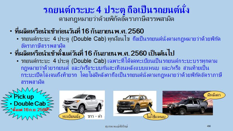 | วิสัชนา | รถยนต์กระบะ 4 ประตู จากรถยนต์นั่ง สู่รถยนต์กระบะที่ออกแบบสำหรับให้มีน้ำหนักรถรวมน้ำหนักบรรทุกไม่เกิน 4,000 กิโลกรัม รัฐมนตรีว่าการกระทรวงการคลังอาศัยอำนาจตามความในมาตรา 5 แห่งพระราชบัญญัติภาษีสรรพสามิต พ.ศ. 2560 ซึ่งใช้บังคับแทนที่พระราชบัญญัติภาษีสรรพสามิต พ.ศ. 2560 ตั้งแต่วันที่ 16 กันยายน พ.ศ. 2560 เป็นต้นไป ได้ออกกฎกระทรวงกําหนดพิกัดอัตราภาษีสรรพสามิต พ.ศ. 2560 เปลี่ยนแปลงรายละเอียดในพิกัดอัตราภาษีสรรพสามิตตอนที่ 6 สินค้ารถยนต์ สำหรับรถยนต์กระบะ 4 ประตู (Double Cab) ตามหลักเกณฑ์ เงื่อนไข และคุณลักษณะที่อธิบดีกรมสรรพสามิตประกาศกำหนด จากพิกัด 06.01 ว่าด้วยรถยนต์นั่ง เป็นพิกัด 06.03 ว่าด้วยรถยนต์กระบะที่ออกแบบสำหรับให้มีน้ำหนักรถรวมน้ำหนักบรรทุกไม่เกิน 4,000 กิโลกรัม เป็นผลทำให้รถยนต์กระบะ 4 ประตู (Double Cab) ตามหลักเกณฑ์ เงื่อนไข และคุณลักษณะที่อธิบดีกรมสรรพสามิตประกาศกำหนด พ้นจากการเป็นรถยนต์นั่ง ตามกฎหมายว่าด้วยพิกัตอัตราภาษีสรรพสามิต ตั้งแต่วันที่ 16 กันยายน พ.ศ. 2560 เป็นต้นไป ตามข้อ 2 ของประกาศกรมสรรพสามิต เรื่อง หลักเกณฑ์ เงื่อนไข และคุณลักษณะของรถยนต์กระบะสี่ประตู (Double Cab) ลงวันที่ 8 มิถุนายน พ.ศ. 2565 อธิบดีกรมสรรพสามิตกำหนดคุณลักษณะของรถยนต์กระบะสี่ประตู (Double Cab) ที่มีความจุของกระบอกสูบไม่เกิน 3,250 ลูกบาศก์เซนติเมตร ตามความใน (3) ของประเภทที่ 06.03 รถยนต์กระบะที่ออกแบบสำหรับให้มีนำหนักรถรวมนำหนักบรรทุกไม่เกิน 4,000 กิโลกรัม ในบัญชีท้ายกฎกระทรวงกำหนดพิกัดอัตราภาษีสรรพสามิต พ.ศ. 2560 ไว้ ดังต่อไปนี้ "ข้อ 2 รถยนต์กระบะสี่ประตู (Double Cab) ที่มีความจุของกระบอกสูบไม่เกิน 3,250 ลูกบาศก์เซนติเมตร ใน (ก) - (ง) และที่มีความจุของกระบอกสูบเกิน 3,250 ลูกบาศก์เซนติเมตร ใน (จ) ของ (3) ของประเภทที่ 06.03 ในบัญชีท้ายกฎกระทรวงกำหนดพิกัดอัตราภาษีสรรพสามิต พ.ศ. 2560 ซึ่งแก้ไขเพิ่มเติมโดยกฎกระทรวงกำหนดพิกัดอัตราภาษีสรรพสามิต (ฉบับที่ 23) พ.ศ. 2565 ต้องมีคุณลักษณะครบถ้วนทุกข้อ และเป็นไปตามหลักเกณฑ์และเงื่อนไข ดังนี 2.1 ตัวถังวางบนโครงสร้าง (Frame Construction) แบบแชสซีส์ของรถยนต์กระบะที่ออกแบบสำหรับให้มีน้ำหนักรถไม่น้อยกว่า 1,200 กิโลกรัม มีน้ำหนักบรรทุกไม่น้อยกว่า 1,000 กิโลกรัม และมีน้ำหนักรถรวมนำหนักบรรทุกไม่เกิน 4,000 กิโลกรัม ซึ่งเป็นแบบเดียวกับรุ่นที่มีการผลิตในประเทศ มีการจัดจำหน่ายทั่วไปหรือส่งออกเป็นปกติวิสัย และจดทะเบียนเป็นรถยนต์กระบะบรรทุกตามกฎหมายว่าด้วยรถยนต์ 2.2 ระบบกันสะเทือนหลังแบบแหนบ 2.3บานประตูจนถึงด้านหลังสุดของห้องคนขับในแนวระนาบเดียวกัน มีความยาวเกินกว่า 180 เซนติเมตร 2.4 ส่วนท้ายเป็น