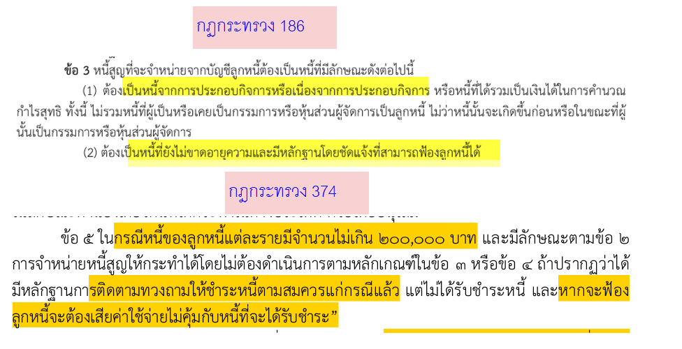 กฏกระทรวง ฉบับที่ 374 (พ.ศ.2564) รายละเอียด/เงื่อนไข | ใหม่ | กฏกระทรวง ฉบับที่ 374 | 3) จำหน่ายหนี้สูญของลูกหนี้แต่ละราย | ไม่ต้องดำเนินการตามหลักเกณฑ์ในข้อที่ 1 หรือ 2 ข้างต้น ถ้าปรากฏว่ามีหลักฐานการติดตามทวงถามตามสมควรแล้ว แต่ไม่ได้รับการชำระหนี้ และหากจะฟ้องลูกหนี้ต้องเสียค่าใช้จ่ายไม่คุ้มกับหนี้ที่จะได้รับ | ลูกหนี้คงค้าง | ไม่เกิน 200,000 บาท |