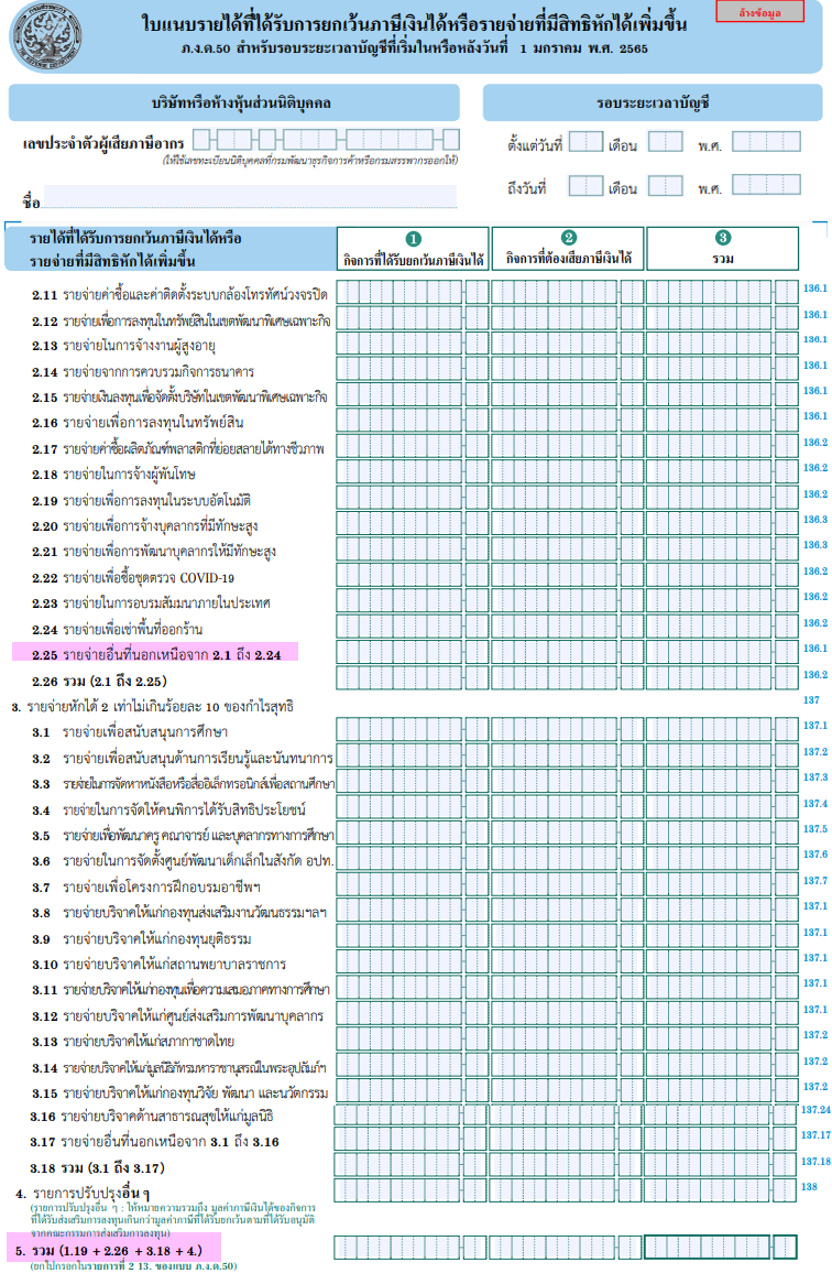 ปุจฉา | สอบถาม เรื่อง เงินสำรองที่บริษัทฯ สำรองไว้เพื่อรอจ่ายให้กับพนักงานที่อายุถึง 60 ปีค่ะ ปี 2021 ตั้งประมาณการไว้:- Cr. เงินสำรองค้างจ่าย บันทึกเงินสำรองไว้ทุกๆ เดือนและบวกกลับตอนสิ้นปี 2021 ใน ภงด.50 ปี 2022 บันทึกจ่ายเงินสำรองค้างจ่าย:- Dr. เงินสำรองค้างจ่าย Cr. เงินสด/เงินฝากธนาคาร ซึ่งในปี 2022 ในงบการเงินเราก็จะไม่มีค่าใช้จ่ายแล้วใช่ไหมคะ แล้วทางภาษีจะเอาเงินสำรอง (คชจ.) มาใส่ตรงไหนใน ภ.ง.ด.50 คะ หรือมีอะไรผิดพลาดตรงไหนหรือไม่คะ จะเอาค่าใช้จ่ายที่เคยบวกกลับไว้มาใช้ตอนจ่ายจริงค่ะ รบกวนด้วยนะคะอาจารย์ สามารถลงรายจ่ายอื่นช่อง 2.20 ได้ไหมคะ |