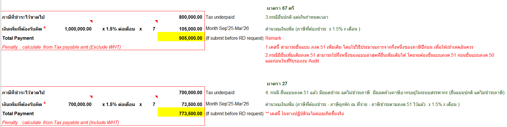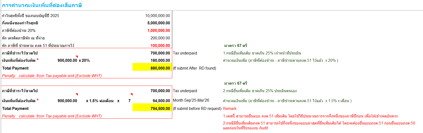 1. เกี่ยวกับการคำนวณเงินเพิ่มตามมาตรา 67 ตรี แห่งประมวลรัษฎากร สำหรับภาษีเงินได้นิติบุคคลตามแบบ ภ.ง.ด.51 เฉพาะกรณีการเสียภาษีเงินได้จากกึ่งหนึ่งของประมาณการกำไรสุทธิซึ่งได้จากกิจการหรือเนื่องจากกิจการที่กระทำในรอบระยะเวลาบัญชี นั้น 1.1 กรณีบริษัทหรือห้างหุ้นส่วนนิติบุคคลที่มีหน้าที่ยื่นรายการและชำระภาษีเงินได้นิติบุคคลครึ่งปีตามมาตรา 67 ทวิ (1) แห่งประมวลรัษฎากร โดยเสียภาษีจากกึ่งหนึ่งของประมาณการกำไรสุทธิซึ่งได้จากกิจการหรือเนื่องจากกิจการที่กระทำในรอบระยะเวลาบัญชี อาจต้องรับผิดเสียเงินเพิ่ม ตามมาตรา 67 ตรี แห่งประมวลรัษฎากร ในแต่ละกรณี ดังนี้ (1) กรณีบริษัทหรือห้างหุ้นส่วนนิติบุคคลไม่ยื่นรายการและชำระภาษีตามมาตรา 67 ทวิ (1) แห่งประมวลรัษฎากร ไม่ว่าจะยื่นแบบ ภ.ง.ด.51 ฉบับปกติ หรือฉบับยื่นเพิ่มเติม ต้องเสียเงินเพิ่มอีกร้อยละ 20 ของจำนวนเงินภาษีที่ต้องชำระตามแบบ ภ.ง.ด.51 ตามมาตรา 67 ทวิ (1) แห่งประมวลรัษฎากร หรือของกึ่งหนึ่งของจำนวนเงินภาษีที่ต้องเสียในรอบระยะเวลาบัญชีนั้น ซึ่งอาจจำแนกได้เป็นแต่ละกรณีดังนี้ (ก) ไม่ยื่นแบบ ภ.ง.ด.51 ภายในกำหนดเวลาตามมาตรา 67 ทวิ (1) แห่งประมวลรัษฎากร ได้แก่ กรณียื่นแบบ ภ.ง.ด.51 ฉบับปกติล่าช้าเกินกำหนดเวลาที่กฎหมายกำหนด และมีจำนวนภาษีเงินได้นิติบุคคลที่ต้องชำระตามแบบ ภ.ง.ด.51 โดยต้องเสียเงินเพิ่มอีกร้อยละ 20 ของจำนวนเงินภาษีที่ต้องชำระตามแบบ ภ.ง.ด.51 (ข) กรณียื่นแบบ ภ.ง.ด.51 เพิ่มเติม และมีจำนวนภาษีเงินได้นิติบุคคลที่ต้องชำระตามแบบ ภ.ง.ด.51 ฉบับเพิ่มเติมดังกล่าว โดยต้องเสียเงินเพิ่มอีกร้อยละ 20 ของจำนวนเงินภาษีที่ต้องชำระตามแบบ ภ.ง.ด.51 (ค) กรณีไม่ยื่นแบบ ภ.ง.ด.51 แต่ได้ยื่นแบบ ภ.ง.ด.50 และมีจำนวนภาษีเงินได้นิติบุคคลที่ต้องเสียตามแบบ ภ.ง.ด.50 โดยต้องเสียเงินเพิ่มอีกร้อยละ 20 ของกึ่งหนึ่งของจำนวนเงินภาษีที่ต้องเสียตามแบบ ภ.ง.ด.50 ในรอบระยะเวลาบัญชีนั้น (ง) กรณีกรณีไม่ยื่นแบบ ภ.ง.ด.51 และเจ้าพนักงานประเมินได้ออกหมายเรียกตรวจสอบการเสียภาษีเงินได้นิติบุคคลของรอบระยะเวลาบัญชีปีนั้น ๆ และมีจำนวนภาษีเงินได้นิติบุคคลที่ต้องเสียตามผลการตรวจสอบ โดยต้องเสียเงินเพิ่มอีกร้อยละ 20 ของกึ่งหนึ่งของจำนวนเงินภาษีที่ต้องเสียตามผลการตรวจสอบของรอบระยะเวลาบัญชีนั้น (2) กรณีบริษัทหรือห้างหุ้นส่วนนิติบุคคลยื่นรายการและชำระภาษีตามมาตรา 67 ทวิ (1) แห่งประมวลรัษฎากร โดยแสดงประมาณการกำไรสุทธิขาดไปเกินร้อยละ 25 ของกำไรสุทธิ ซึ่งได้จากกิจการหรือเนื่องจากกิจการที่กระทำในรอบระยะเวลาบัญชีนั้น "โดยไม่มีเหตุอันสมควร" ต้องเสียเงิ