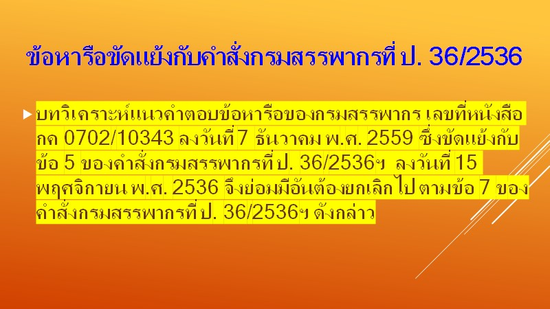 | ปุจฉา | บทวิเคราะห์แนวคำตอบข้อหารือของกรมสรรพากร เลขที่หนังสือ กค 0702/10343 ลงวันที่ 7 ธันวาคม พ.ศ. 2559 ซึ่งขัดแย้งกับข้อ 5 ของคำสั่งกรมสรรพากรที่ ป. 36/2536 ลงวันที่ 15 พฤศจิกายน พ.ศ. 2536 จึงย่อมมีอันต้องยกเลิกไป ตามข้อ 7 ของคำสั่งกรมสรรพากรที่ ป. 36/2536ฯ อย่างไร |