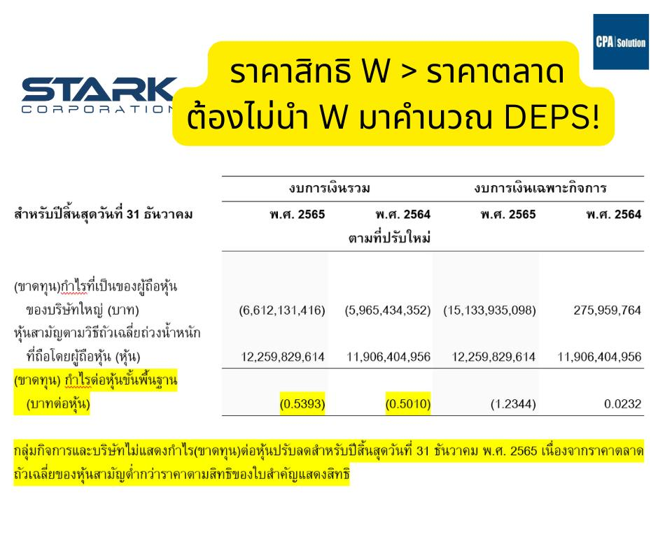 | คำตอบ | STARK มาอีกแล้วนะครับ คราวนี้เป็นประเด็นเกี่ยวกับ TAS 33 เรื่องกำไรต่อหุ้น STARK ก็มีใบสำคัญแสดงสิทธิซื้อหุ้น (warrant) คงค้างอยู่ ซึ่งถ้าผู้ถือ warrant ก็สามารถใช้สิทธิซื้อหุ้น STARK ในราคาตามสิทธิ 5 บาท ครับ แต่ว่าปัจจุบัน STARK ราคาแค่ 0.02 บาท เท่านั้น (ตอนสิ้นปี 2565 ก็ประมาณไม่ถึง 3 บาท) ดังนั้นคงไม่มีใครใช้สิทธิแน่นอน ด้วยเหตุนี้ warrant ที่ว่าจึงไม่กระทบกับกำไรต่อหุ้นนะครับ ดังนั้นพี่น้องจึงต้องทำความเข้าใจให้แม่นๆ นะครับว่า ถ้าราคาตามสิทธิของ warrant สูงกว่าราคาตลาด (เช่นกรณี stark ราคาตามสิทธิ 5 บาท แต่ราคาตลาดแค่ 0.02 บาท เท่านั้น) แบบนี้ก็จะไม่ effect อะไรกับการคำนวณกำไรต่อหุ้นปรับลด ลองดูจากหมายเหตุประกอบที่ผมใส่เข้าไปใน Post ประกอบนะ ………………………………… สู้เขานะครับ แล้วถ้าจะเตรียมสอบ AC1 – AC2 แบบออนไลน์หรือสดก็ inbox หรือ lineID: @cpasolution หรือ www.cpasolution.net เราเตรียมเนื้อหาที่ทันสมัยเพิ่มความมั่นใจกับพี่น้องผู้เข้าสอบอย่างเต็มที่ครับ