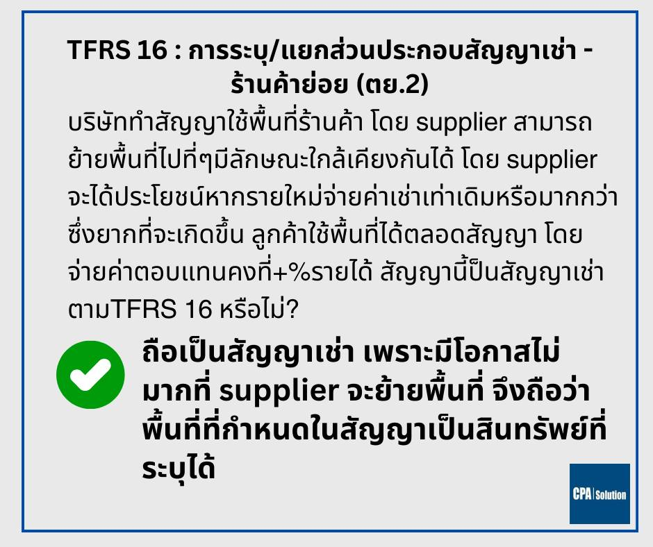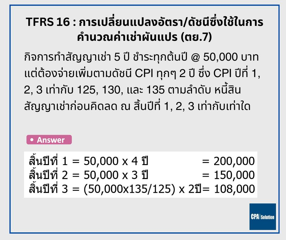 คำตอบ | พี่น้อง AC1 สภาฯ ท่านให้ตัวอย่างในคู่มืออธิบาย TFRS 16 ซึ่งถือเป็นหนึ่งในหัวข้อขาประจำที่พี่น้องต้องลงรายละเอียด ลองดูตามโพสต์นี้นะครับน่าจะมีส่วนกับคะแนนประมาณ 5 – 10 คะแนน นอกจากนี้ยังมีตัวอย่างอธิบายอีก 2 ข้อ ที่เคยทำโพสต์ไปแล้ว ตามนี้ครับ สัญญาขายแล้วเช่ากลับ ต.ย. 9 สู้เขานะครับ ช่วงหยุดยาวถ้าไม่มีโปรแกรมไปเที่ยวที่ไหนก็เปลี่ยนเวลาเป็นคะแนนสอบกัน ด้วยการลงติว AC1 – AC2 แบบออนไลน์ของ CPA Solution กับเนื้อหาที่ดีที่สุดที่กว่า 90% ของ CPA หน้าใหม่เลือกเตรียมตัว Inbox หรือ lineID: @cpasolution หรือ www.cpasolution.biz เรียนได้ทันทีแบบ unlimit ในช่วง 4 เดือน สู้เขาครับ มาทำให้เป็นเรื่องง่ายด้วยบริการของ Tax-EZ สนใจสมัครสมาชิกเพื่อรับสิทธิพิเศษ คลิกที่นี่ ติดตามข่าวสารของ Tax-EZ ได้ทาง Website : tax-ez.info , Facebook Page : Tax-EZ ติดตาม FB เพจที่ให้ความรู้ทางด้านบัญชีกับ FB CPA Solution ดร.สมศักดิ์ ประถมศรีเมฆ คลิ๊ก ขอขอบคุณข้อมูลจาก FB CPA Solution ดร.สมศักดิ์ ประถมศรีเมฆ ที่อนุญาตให้นำความรู้ดีๆ มาแบ่งปันใน Website Tax-EZ ค่ะ |