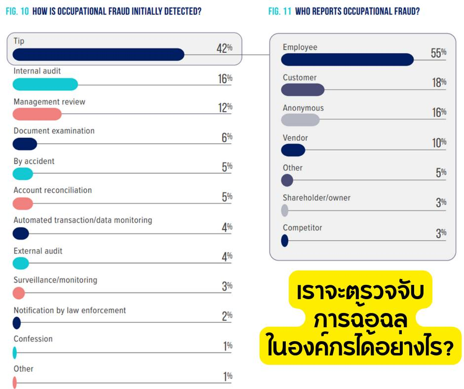 | คำตอบ | เรามาดูเรื่องการทุจริตภายในองค์กรกันต่อนะครับพี่น้อง จากโพสต์ที่แล้วเราก็พอทราบถึงความเสี่ยง และรูปแบบการทุจริตกันแล้ว โพสต์นี้ก็มาตั้งคำถามกันว่า “แล้วเราจะตรวจจับการฉ้อฉลในองค์กรได้อย่างไร” จากสถิติที่ ACFE จัดทำ • 42% ของการฉ้อฉล สามารถตรวจจับได้จากการแจ้งเบาะแส (TIP) ซึ่ง >50% ได้ข้อมูลจากพนักงาน • รองลงมาอีก 12% คือการสอบทานโดยฝ่ายบริหาร ส่วนผู้สอบบัญชีภายนอก สามารถตรวจจับการฉ้อฉลภายในองค์กรได้เพียง 4% เท่านั้น เพราะไม่ได้มีหน้าที่โดยตรงในการตรวจจับทุจริต จากสถิตินี้ถือเป็นเรื่องที่คุ้มค่าสำหรับองค์กรเป็นอย่างมากที่จะเปิดช่องทางแจ้งข่าวทุจริต ไม่ว่าจะเป็น email, hotline, facebook, และช่องทางอื่นๆ เพื่อให้คนที่รู้เบาะแสแจ้งข่าวมา (อย่างไรก็ตามสำหรับในไทยก็คงต้องเพิ่มการมีส่วนร่วมให้กับพนักงานในองค์กรด้วย เพราะภายใต้สังคมชนชั้นแบบไทยๆ อาจลดแรงจูงใจของการแจ้งข่าวทุจริต โดยเฉพาะจากผู้น้อย) นอกจากนี้การลงทุนใน internal audit ก็ถือเป็นอะไรที่คุ้มค่ามาก จากสถิติของ ACFE การฉ้อฉลภายในองค์กรมีมูลค่าสูงราวๆ 5% ของรายได้เลยนะครับ สมมติมียอดขาย 1000 ล้านบาทต่อปี ถ้า IA สามารถตรวจจับทุจริตได้ก็จะประหยัดได้ 1000m x 5% x ความน่าจะเป็นที่ IA ตรวจจับได้ 16% = 8m ต่อปี ถ้าจ้าง IA เจ๋งๆ สัก 2m ต่อปี แบบนี้ก็ถือว่าคุ้มค่าครับ และจะเรียนว่าผู้สอบบัญชีภายนอกไม่ได้มีหน้าที่โดยตรงในการตรวจจับทุจริต เขามีหน้าที่ตรวจสอบว่างบการเงินถูกต้องตามที่ควรหรือไม่เท่านั้น ดังนั้น เราจึงไม่ควรคาดหวังแบบผิดๆ ว่าถ้าผู้สอบบัญชีแสดงงบอย่างถูกต้องตามที่ควรแล้ว กิจการจะปลอดจากการทุจริตนะครับ