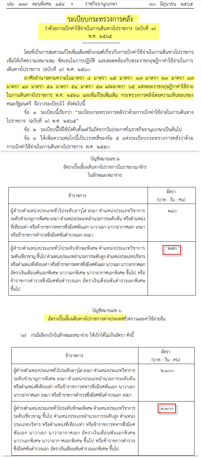 อ้างอิงกฎหมายที่เกี่ยวข้อง คำสั่งกรมสรรพากรที่ ป. 59/2538 พระราชกฤษฎีกาค่าใช้จ่ายในการเดินทางไปราชการพ.ศ. 2560 (ฉบับที่ 9) ระเบียบกระทรวงการคลังว่าด้วยการเบิกค่าใช้จ่ายในการเดินทาง ไปราชการ (ฉบับที่ 3) พ.ศ. 2565