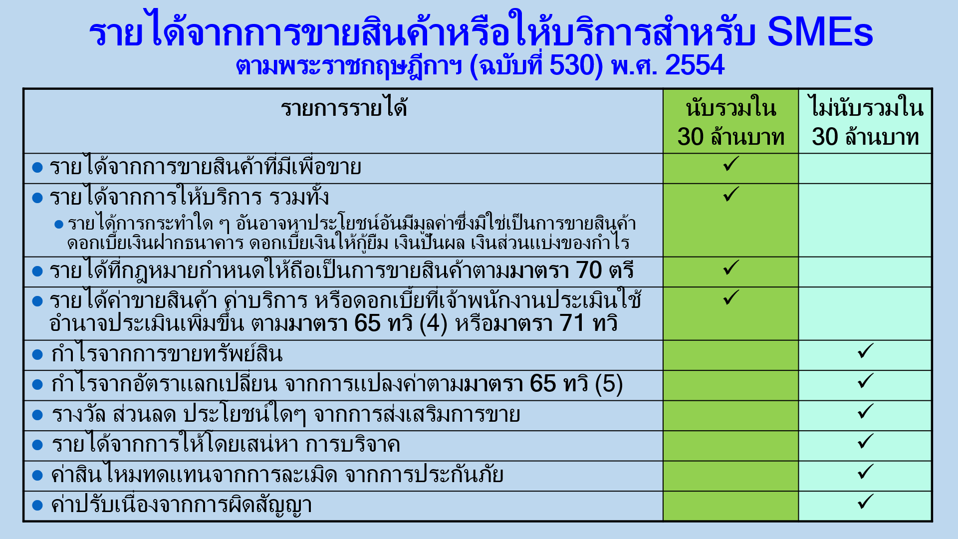 2. รายได้จากการขายสินค้า และรายได้จากการให้บริการในรอบระยะเวลาบัญชีไม่เกินกว่า 30 ล้านบาท (1) รายได้จากการขายสินค้า หมายความว่า รายได้จากจำหน่าย จ่าย หรือโอนสินค้า อันได้แก่ ทรัพย์สินที่มีรูปร่างและไม่มีรูปร่างที่อาจมีราคาและถือเอาได้ ที่มีไว้เพื่อขายเท่านั้น ไม่ว่าจะโดยมีหรือไม่มีประโยชน์หรือค่าตอบแทน และให้หมายความรวมถึงสัญญาให้เช่าซื้อสินค้า สัญญาซื้อขายผ่อนชำระที่กรรมสิทธิ์ในสินค้ายังไม่โอนไปยังผู้ซื้อเมื่อมีการส่งมอบสินค้าให้แก่ผู้ซื้อแล้ว และการส่งสินค้าออกนอกราชอาณาจักร (2) รายได้จากการให้บริการ หมายความว่า รายได้จากการประกอบกิจการให้บริการ รวมทั้งรายได้จากการกระทำใด ๆ อันอาจหาประโยชน์อันมีมูลค่าซึ่งมิใช่เป็นการขายสินค้า อาทิ ดอกเบี้ยรับ เงินปันผลหรือเงินส่วนแบ่งของกำไร อนึ่ง รายได้จากการขายสินค้า และการให้บริการดังกล่าว ย่อมหมายความรวมถึง รายได้ตามที่เจ้าพนักงานประเมินใช้อำนาจประเมินตามมาตรา 65 ทวิ (4) หรือมาตรา 71 ทวิ รวมทั้งรายได้ที่กฎหมายกำหนดให้ถือว่าเป็นการขายสินค้าเฉพาะที่มีเพื่อขายตามมาตรา 70 ตรี แห่งประมวลรัษฎากร ด้วย