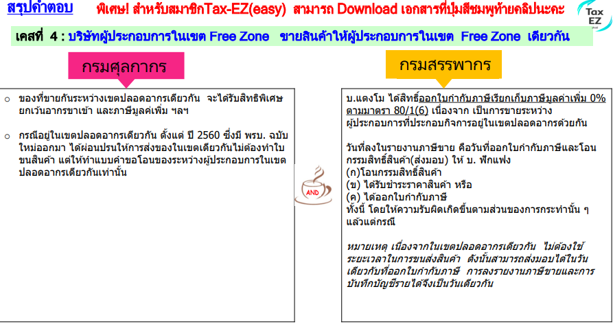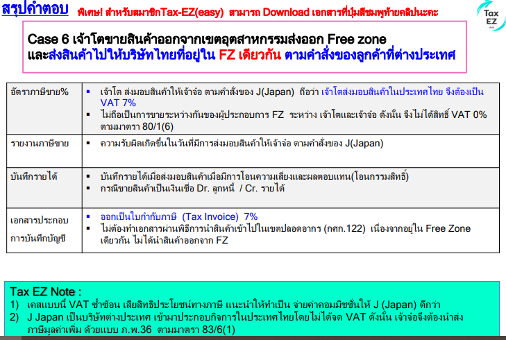 สามารถศึกษาเคสตามตัวอย่างได้ตาม Link https://tax-ez.info/Training/View/fPhy9BsT EP.15 ขายสินค้าผู้ประกอบการ Free zone (Tax Case Study)
