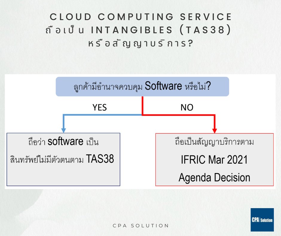 | คำตอบ | คำถามจากทางบ้าน : Cloud Service ถือเป็นสินทรัพย์ไม่มีตัวตน หรือค่าใช้จ่ายล่วงหน้า? ประเด็นมันอยู่ที่คำว่า "control" ถ้ามีอำนาจควบคุมในระบบก็ถือเป็นสินทรัพย์ไม่มีตัวตนตาม TAS 38 แต่ถ้าไม่มีอำนาจควบคุม (ซึ่งส่วนใหญ่น่าจะไม่มี) ก็จะถือเป็นการใช้บริการ จะรับรู้เป็นค่าใช้จ่ายล่วงหน้าและรับรู้เป็นค่าใช้จ่ายเข้า P/L ตลอดอายุการให้ประโยชน์ ลองศึกษาประเด็นนี้กันนะครับ เผื่อจะได้คะแนนสอบ AC1 สัก 1 - 5 คะแนน แล้วถ้าต้องการเตรียมสอบ AC1 - AC2 ก็ inbox หรือ lineID: @cpasolution หรือ www.cpasolution.biz เราเตรียมเนื้อหาที่ดีที่สุดให้กับพี่น้องครับ