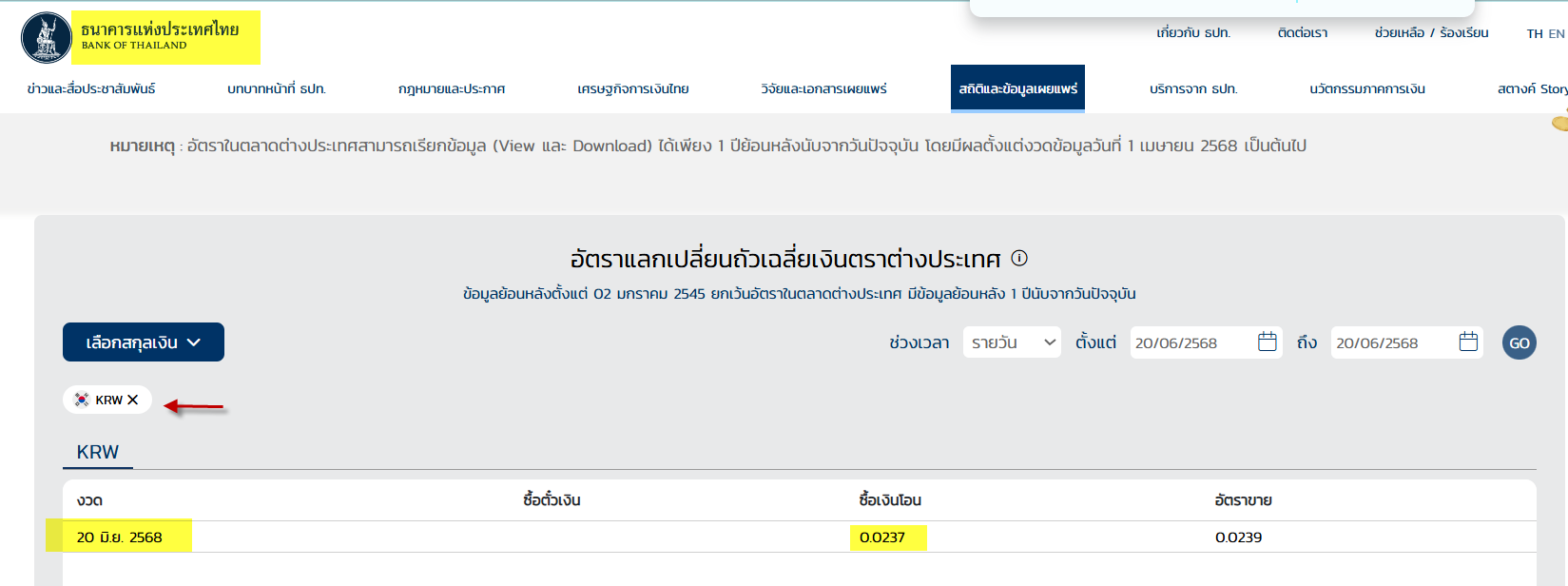 ตัวอย่าง วันที่ระบุให้มีผลในการหักกลบลบหนี้ คือวันที่ 23 มิถุนายน 2568 บริษัทควรใช้อัตราซื้อถัวเฉลี่ย BOT วันที่ 20 มิถุนายน 2568= 0.0237/วอน ในการแปลงค่าเงินวอนให้เป็นเงินไทยบาท