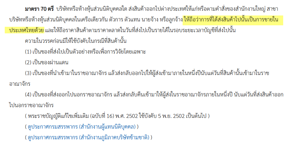 | คำตอบ | ตอบ ภาษีเงินได้นิติบุคคล เนื่องจาก มาตรา 70 ตรี แห่งประมวลรัษฎากร อยู่ภายใต้ ส่วน 3 หมวด 3 ลักษณะ 2 แห่งประมวลรัษฎากร : ซึ่ง ส่วน 3 คือ การเก็บภาษีจากบริษัทและห้างหุ้นส่วนนิติบุคคล ดังนั้น คำว่า “เป็นการขายในประเทศไทย” นั้น จึงเป็นการย้ำว่า ธุรกรรมนี้ (การส่งของออกไปโดยไม่คิดมูลค่า) ให้หมายความ ว่า เป็นการขายในประเทศไทย (ประเทศไทย จึงมีสิทธิ์เก็บภาษีเงินได้นิติบุคคล ตามมาตรา 66 แห่งประมวลรัษฎากร)การส่งออกทรัพย์สินเนื่องจากเลิกกิจการในประเทศไทย ไปให้บริษัทแม่ที่ประเทศญี่ปุ่น ให้ ถือเป็นการขาย ในรอบระยะเวลาบัญชีที่ส่งไปนั้น โดยให้ถือราคาสินค้าตามราคาตลาด (ราคา FOB) ในวันที่ส่งไปเป็นรายได้ ทั้งนี้ ตามมาตรา 70 ตรี แห่งประมวลรัษฎากร