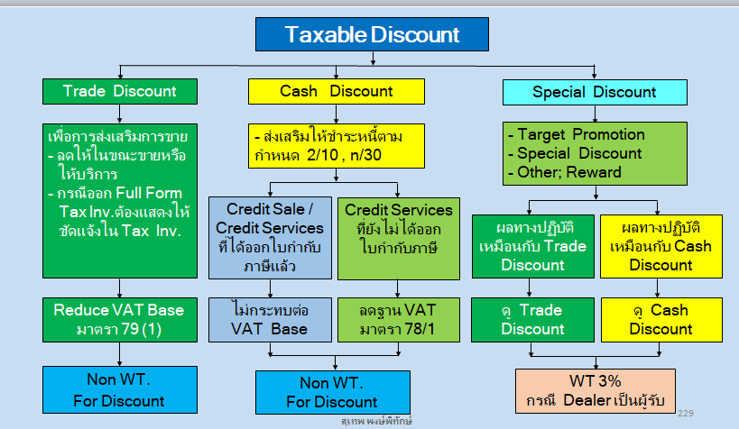 3) กรณีภาษีหัก ณ ที่จ่าย 3.1) เมื่อบริษัทฯ จำหน่ายน้ำมัน ให้ส่วนลดส่งเสริมการขายแก่ลูกค้า End user >> จะไม่ต้องหักภาษี ณ ที่จ่าย 3% 3.2) เมื่อบริษัท PT ให้ส่วนลดส่งเสริมการขายแก่บริษัทฯ จำหน่ายน้ำมัน บริษัทฯ ผู้จัดจำหน่าย (Dealer/ Distributor) >> จะต้องถูกหักภาษี ณ ที่จ่าย 3% ของมูลค่ารางวัล/ส่วนลด/ประโยชน์ที่จ่ายให้ ตามมาตรา 3 เตรส ประกอบกับคำสั่งกรมสรรพากร ที่ ท.ป. 4/2528 ข้อ 12/2(2) และ คำสั่งกรมสรรพากรที่ ป.118/2545 ข้อ 1 กฎหมายที่เกี่ยวข้อง