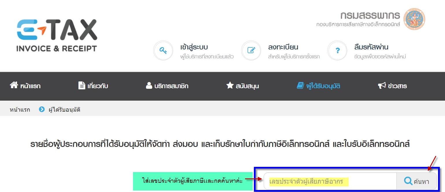 หมายเหตุ 1. ตรวจสอบรายชื่อ ผู้ประกอบการที่ได้รับอนุมัติให้จัดทำ ส่งมอบ และเก็บรักษาใบกำกับภาษีอิเล็กทรอนิกส์ และใบรับอิเล็กทรอนิกส์ ได้ที่นี่