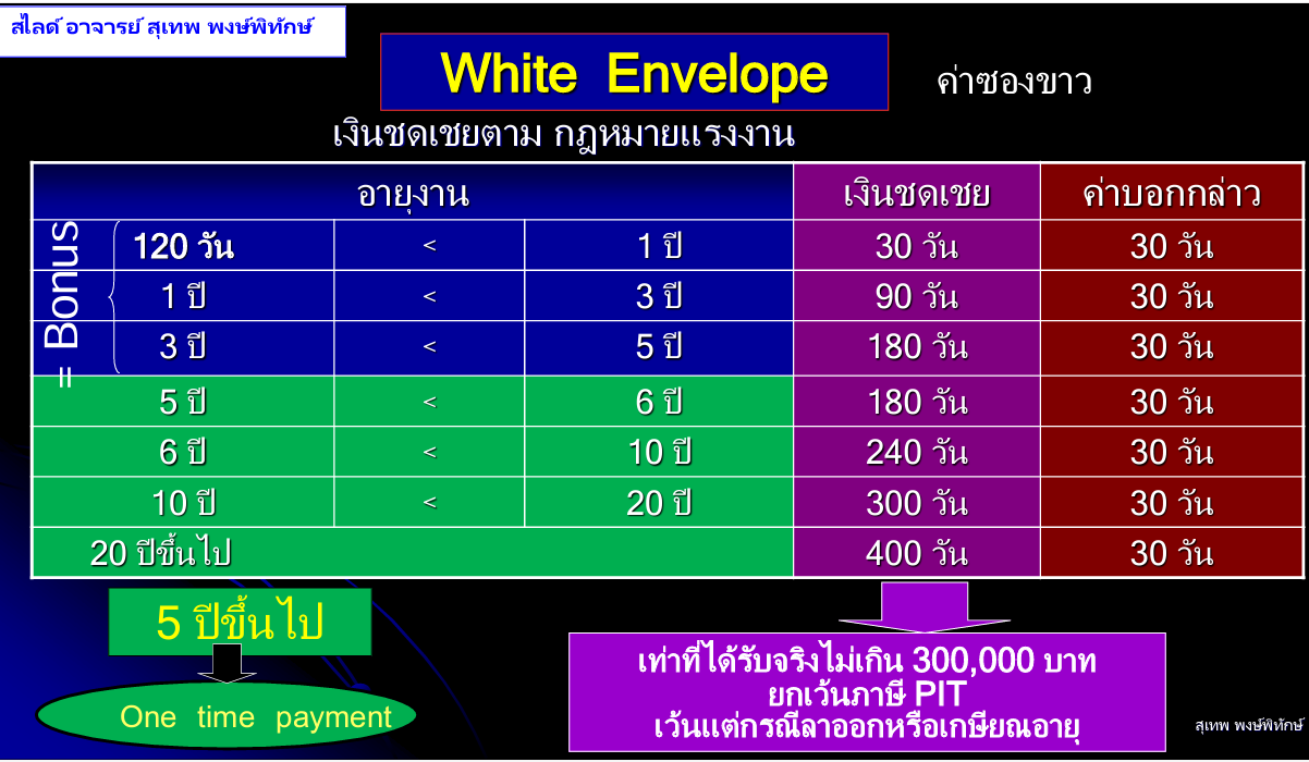>> สามารถเลือกได้ว่าจะคำนวณภาษีตามมาตรา 48(1) หรือ มาตรา 48(5) >> หักภาษี ณ ที่จ่ายตาม มาตรา 50 (1) วรรค 3 3..ในกรณีที่จ่ายเกินสามแสน เงินส่วนเกิน ฯลฯ ที่ไม่เข้าเงื่อนไขตาม กฎกระทรวงฉบับที่ 126 ข้อ 51 1 เกินค่าจ้างหรือเงินเดือนค่าจ้างของการทำงานสามร้อยวันสุดท้าย หรือ 2 เกินสามแสนบาท หรือ 3 เกินกฏหมายเเรงงานกำหนด หรือ