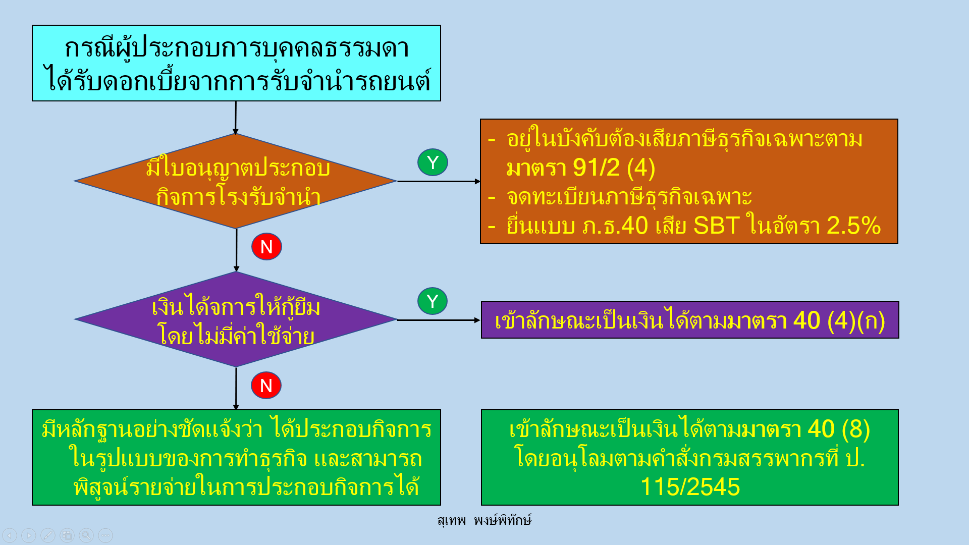 | ปุจฉา | ผมรบกวนคำถามเกี่ยวกับการเสียภาษีของบุคคลธรรมดา ประกอบกิจการรับจำนำทะเบียนรถ รายรับที่ผู้ประกอบการที่ประกอบการในนามบุคคลธรรมดาได้รับ ถือเป็นเงินได้ประเภทใด ดังนี้ 1. ถือเป็นการให้กู้ยืมเงิน เป็นเงินได้มาตรา 40 (4)(ก) ดอกเบี้ย และต้องเสียภาษีธุรกิจเฉพาะในอัตราร้อยละ 3 หรือ 2. ถือเป็นการประกิจการโรงรับจำนำ เป็นเงินได้ตามมาตรา 40 (4)(ก) ดอกเบี้ยจากโรงรับจำนำ เสียภาษีธุรกิจเฉพาะร้อยละ 2.5 3. มาตรา 40 (8) เงินได้อื่น และไม่ต้องเสียภาษีธุรกิจเฉพาะหรือ 4. มาตรา 40 (8) เงินได้อื่น เสียภาษีธุกิจเฉพาะจากดอกเบี้ยร้อยละ 3 5. มาตรา 40 (8) เงินได้จากการรับสินไถ่สังหาริมทรัพย์ (ขายฝาก) เบื้องต้นผมมีความเห็นว่า ถือเป็นการให้กู้ยืมเงินได้รับดอกเบี้ยต้องเสียภาษีธุรกิจเฉพาะ เข้าข่ายการประกอบกิจการเยี่ยงธนาคารส่วนภาษีเงินได้หากไม่มีการจ้างพนักงานถือเป็นเงินได้ตามมาตรา 40 (4)(ก) ไม่สามารถหักค่าใช้จ่ายได้ แต่มีปัญหาว่าหากผู้ประกอบการที่มีการจ้างพนักงานจะให้ถือเป็นเงินได้มาตรา 40 (8) ได้หรือไม่ |