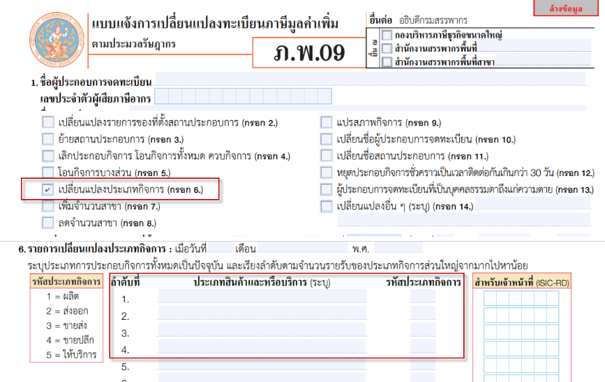 มาตรา 85/6ในกรณีที่มีการเปลี่ยนแปลงรายการที่ได้จดทะเบียนภาษีมูลค่าเพิ่มในสาระสำคัญ ซึ่งรวมถึงการเปลี่ยนแปลงชื่อสถานประกอบการ ประเภทกิจการ ประเภทสินค้าหรือบริการ ให้ผู้ประกอบการจดทะเบียนแจ้งการเปลี่ยนแปลงนั้น ณ สถานที่ที่ได้จดทะเบียนภาษีมูลค่าเพิ่มไว้ภายในสิบห้าวันนับจากวันที่มีการเปลี่ยนแปลงเกิดขึ้น การแจ้งการเปลี่ยนแปลงรายการตามวรรคหนึ่ง และการออกใบทะเบียนภาษีมูลค่าเพิ่มที่เปลี่ยนแปลงรายการแล้ว ให้เป็นไปตามแบบ หลักเกณฑ์ วิธีการ และเงื่อนไขที่อธิบดีกำหนด ( ดูประกาศอธิบดีกรมสรรพากร เกี่ยวกับภาษีมูลค่าเพิ่ม (ฉบับที่ 65) ) ( ดูประกาศอธิบดีกรมสรรพากร เกี่ยวกับภาษีมูลค่าเพิ่ม (ฉบับที่ 131) )