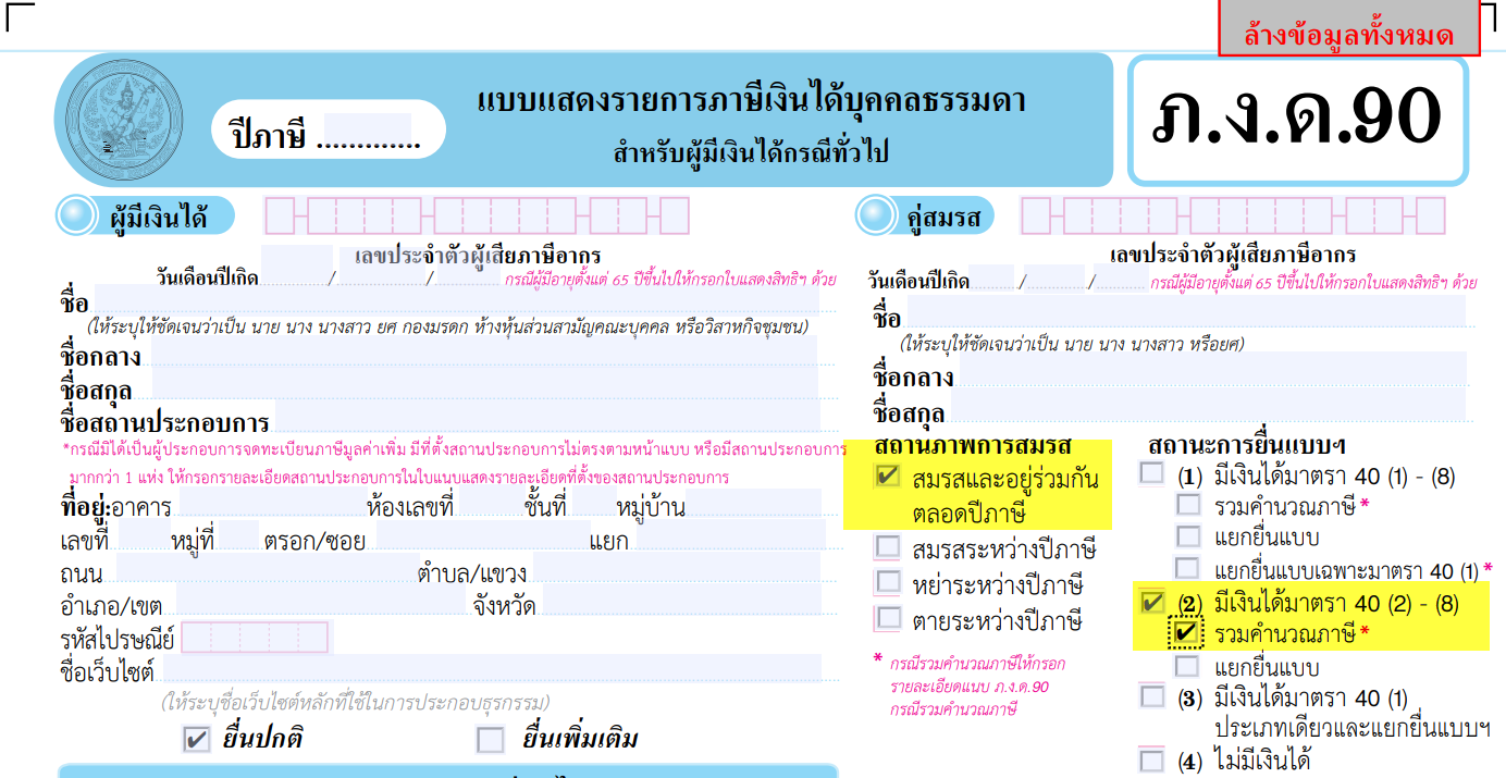 ให้เลือกสถานภาพการสมรส และเลือก (2) มีเงินได้ ม.40(2)-(8) รวมคำนวณภาษี