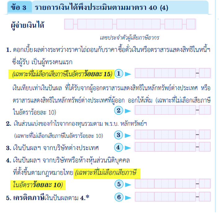 ข้อที่ 3 รายการเงินได้พึงประเมินตามมาตรา 40(4) ไม่ต้องกรอกยอดเงินได้ดอกเบี้ย และเงินปันผล เพราะเลือกที่จะเสียภาษีแบบ Final tax แล้ว หากเลือกยื่นแบบรวมกัน และเลือก Final tax กรณีนี้ถึงจะสามารถหักลดหย่อนส่วนตัวของสามีได้ (ไม่ได้หักลดหย่อนในฐานะสามีไม่มีเงินได้)