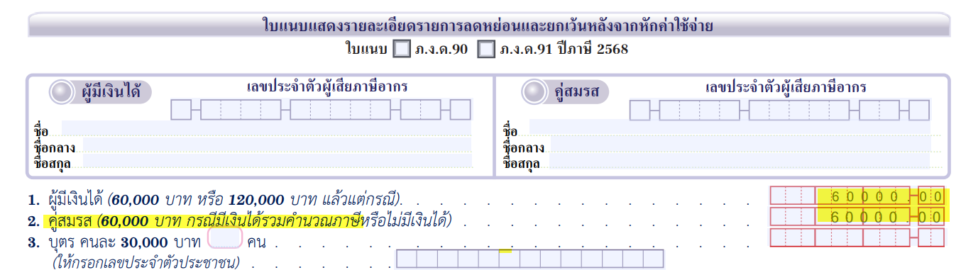 ในแนบการหักลดหย่อน ให้กรอกลดหย่อนคู่สมรส 60,000 บาท กรณีมีเงินได้และเลือกยื่นรวมคำนวณภาษี