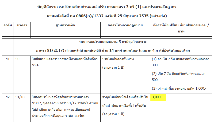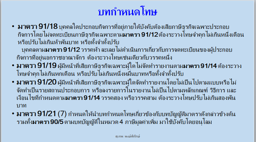 มาตรา 91/18บุคคลใดประกอบกิจการที่อยู่ภายใต้บังคับต้องเสียภาษีธุรกิจเฉพาะประกอบกิจการโดยไม่จดทะเบียนภาษีธุรกิจเฉพาะตามมาตรา 91/12 ต้องระวางโทษจำคุกไม่เกินหนึ่งเดือน หรือปรับไม่เกินห้าพันบาท หรือทั้งจำทั้งปรับ บุคคลตามมาตรา 91/12 วรรคห้า ละเลยไม่ดำเนินการเกี่ยวกับการจดทะเบียนของผู้ประกอบกิจการที่อยู่นอกราชอาณาจักร ต้องระวางโทษเช่นเดียวกับวรรคหนึ่ง