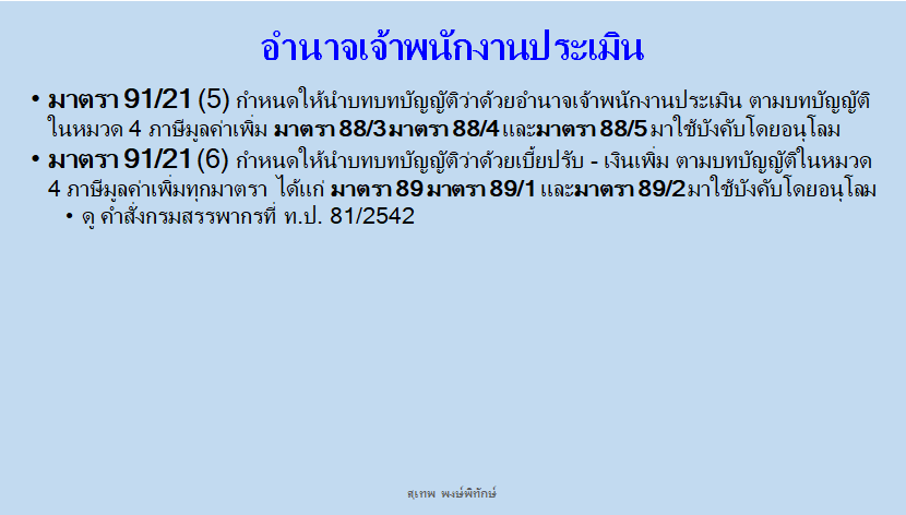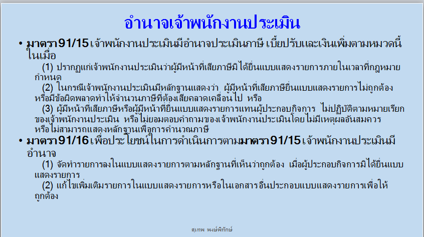 มาตรา 91/15เจ้าพนักงานประเมินมีอำนาจประเมินภาษี เบี้ยปรับ และเงินเพิ่มตามหมวดนี้ในเมื่อ (1) ปรากฏแก่เจ้าพนักงานประเมินว่าผู้มีหน้าที่เสียภาษีมิได้ยื่นแบบแสดงรายการภายในเวลาที่กฎหมายกำหนด (2) ในกรณีเจ้าพนักงานประเมินมีหลักฐานแสดงว่า ผู้มีหน้าที่เสียภาษียื่นแบบแสดงรายการไม่ถูกต้อง หรือมีข้อผิดพลาดทำให้จำนวนภาษีที่ต้องเสียคลาดเคลื่อนไป หรือ (3) ผู้มีหน้าที่เสียภาษีหรือผู้มีหน้าที่ยื่นแบบแสดงรายการแทนผู้ประกอบกิจการไม่ปฏิบัติตามหมายเรียกของเจ้าพนักงานประเมิน หรือไม่ยอมตอบคำถามของเจ้าพนักงานประเมินโดยไม่มีเหตุผลอันสมควร หรือไม่สามารถแสดงหลักฐานเพื่อการคำนวณภาษี