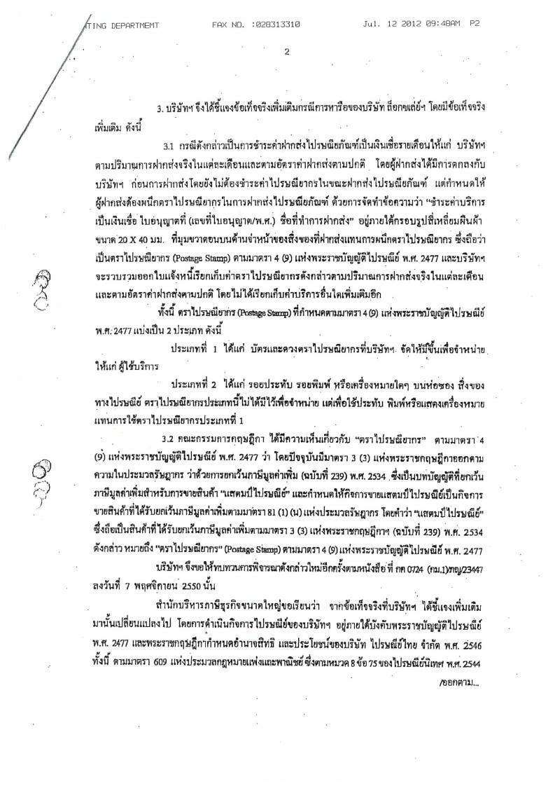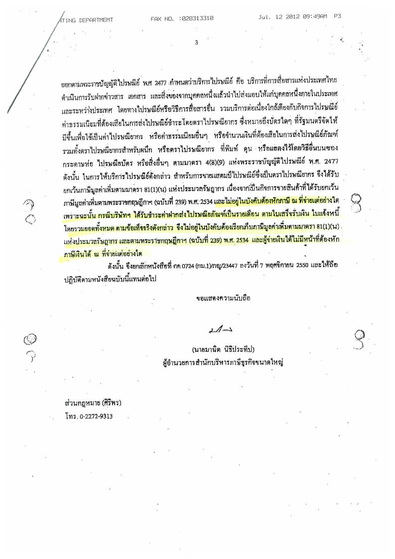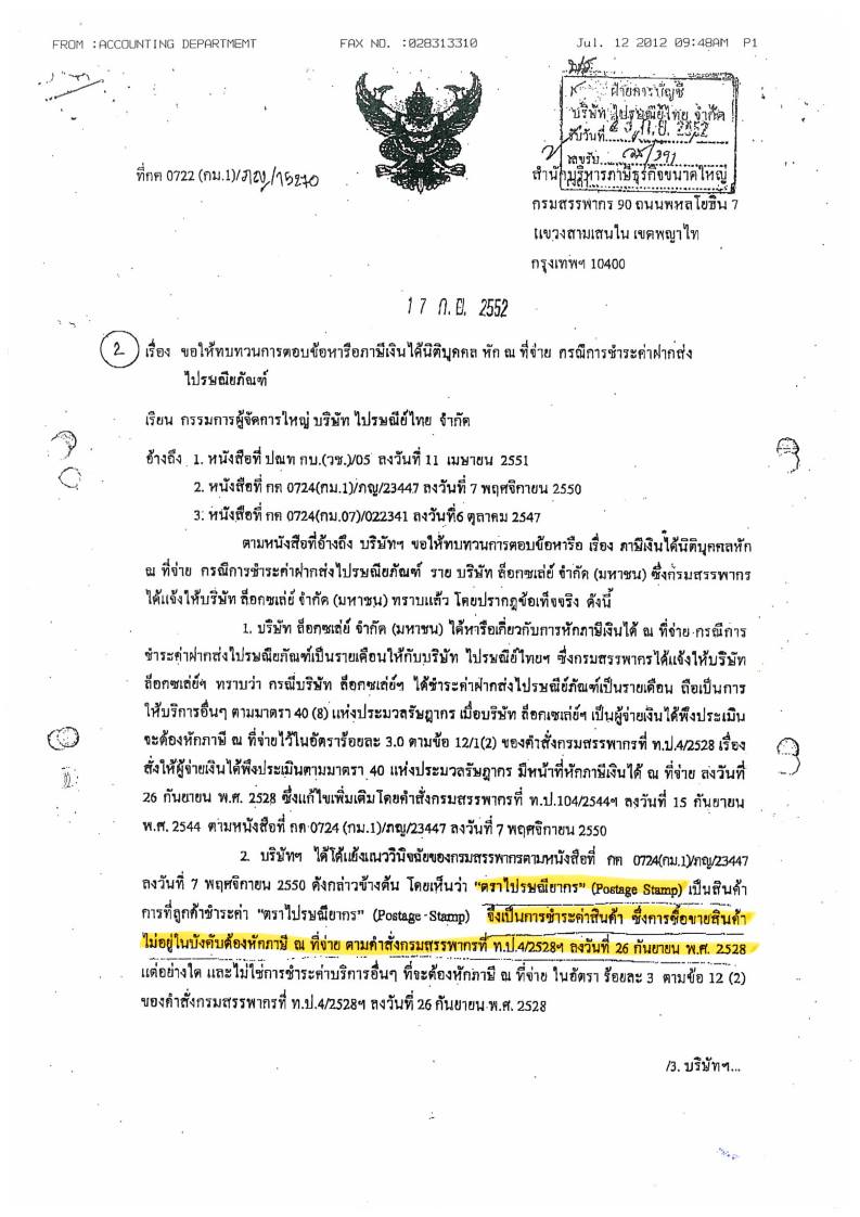 ที่ กค 0722(กม.1)/ภญ/15270 ลงวันที่ 17 กันยายน 2552 เรื่อง ขอให้ทบทวนการตอบข้อหารือภาษีเงินได้นิติบุคคล หัก ณ ที่จ่าย กรณีการชำระค่าฝากส่งไปรษณียภัณฑ์ เรียน กรรมการผู้จดการใหญ่ บริษัท ไปรษณีย์ไทย จำกัด อ้างถึง 1. หนังสือที่ ปณท กบ.(วช.)/05 ลงวันที่ 11 เมษายน 2551 2. หนังสือที่ กค 0724(กม.1)/ภญ/23447 ลงวันที่ 7 พฤศจิกายน 2550 3. หนังสือที่ กค 0724(กม.07)/022341 ลงวันที่ 6 ตุลาคม 2547