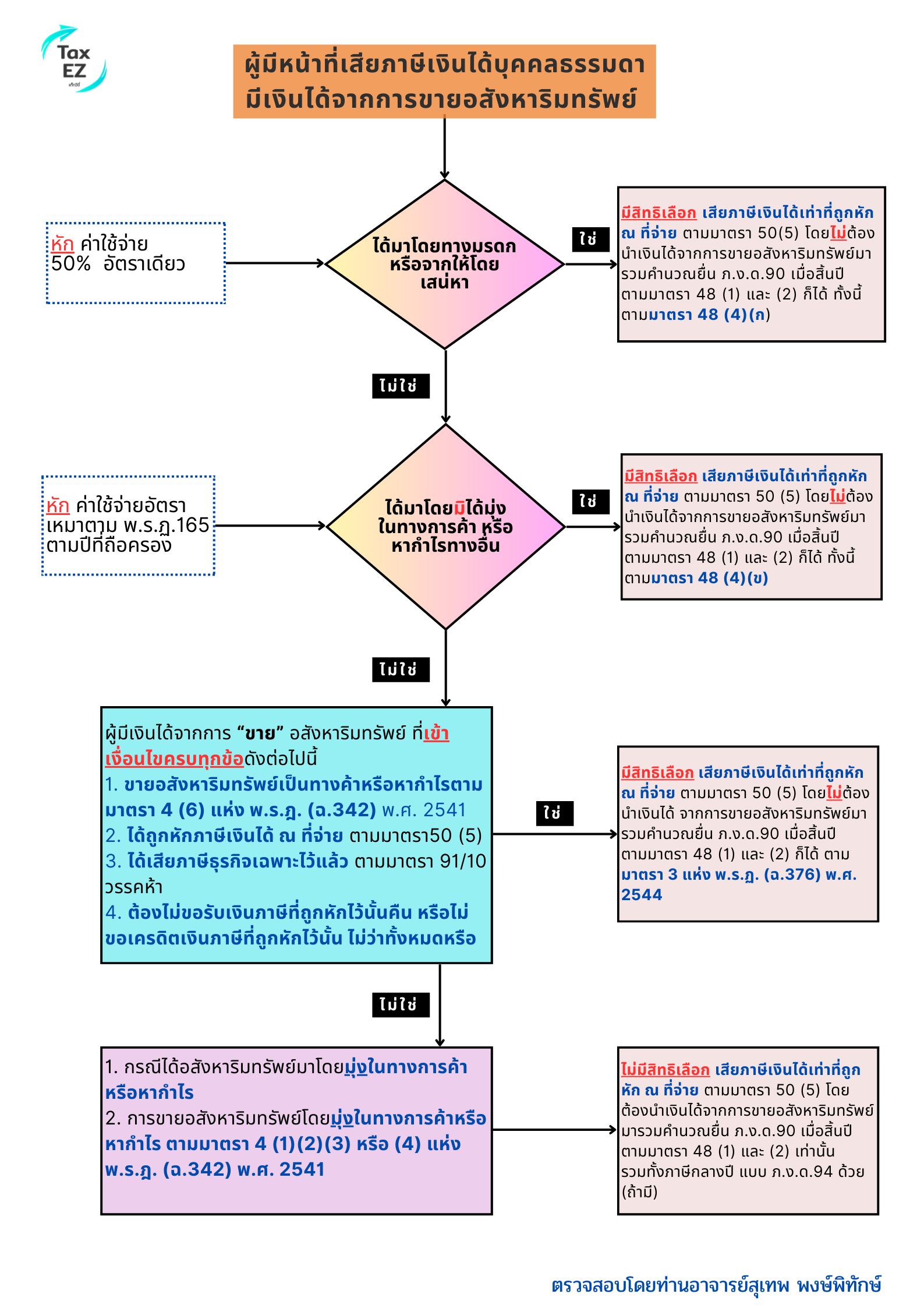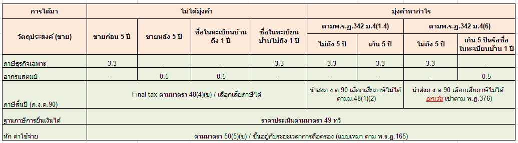 คำสั่งกรมสรรพากร ที่ ป. 100/2543 เรื่อง การเสียภาษีเงินได้บุคคลธรรมดาและอากรแสตมป์ กรณีการขาย การโอนกรรมสิทธิ์หรือสิทธิครอบครองในอสังหาริมทรัพย์ --------------------------------------------- เพื่อให้เจ้าพนักงานสรรพากรถือเป็นแนวทาง ปฏิบัติในการตรวจและแนะนำสำหรับ การเสียภาษีเงินได้บุคคลธรรมดาและอากรแสตมป์ กรณีการขาย การโอนกรรมสิทธิ์หรือ สิทธิครอบครองในอสังหาริมทรัพย์ กรมสรรพากรจึงมีคำสั่งดังต่อไปนี้ ข้อ 1 ให้ยกเลิกคำสั่งกรมสรรพากรที่ ป.9/2528 เรื่อง การโอนกรรมสิทธิ์หรือ สิทธิครอบครองใน อสังหาริมทรัพย์ กรณีที่ไม่ต้องเสียภาษีเงินได้และกรณีที่เจ้าพนัก งานประเมินไม่ต้องกำหนดราคาขาย ลงวันที่ 20 พฤษภาคม พ.ศ. 2528 ข้อ 2 คำว่า "ขาย" ในการจัดเก็บภาษีเงินได้ หมายความรวมถึง ขายฝาก แลกเปลี่ยน ให้ โอนกรรมสิทธิ์หรือสิทธิครอบครองในอสังหาริมทรัพย์ ไม่ว่าด้วยวิธีใด และไม่ว่าจะมีค่าตอบแทนหรือไม่ ตามมาตรา 39 แห่งประมวลรัษฎากร แต่ไม่รวมถึง (1) การขาย แลกเปลี่ยน ให้ โอนกรรมสิทธิ์หรือสิทธิครอบครองใน อสังหาริมทรัพย์ให้แก่ส่วนราชการ หรือรัฐวิสาหกิจที่มิใช่บริษัทหรือห้าง หุ้นส่วนนิติบุคคลในกรณีดังต่อไปนี้ (ก) การให้ การโอนกรรมสิทธิ์หรือสิทธิครอบครองในอสังหาริม ทรัพย์โดยไม่มีค่าตอบแทน (ข) การแลกเปลี่ยนกรรมสิทธิ์หรือสิทธิครอบครองในอสังหาริมทรัพย์กับส่วน ราชการหรือรัฐวิสาหกิจที่มิใช่บริษัท หรือห้างหุ้นส่วนนิติบุคคลเฉพาะในกรณีที่ส่วนราชการหรือ รัฐวิสาหกิจนั้น มิได้มีการจ่ายค่าตอบแทนเป็นอย่างอื่น นอกจากอสังหาริมทรัพย์ที่แลกเปลี่ยนนั้น (2) การโอนโดยทางมรดกให้แก่ทายาท ซึ่งกรรมสิทธิ์หรือสิทธิครอบครองในอสังหาริมทรัพย์ ข้อ 3 ผู้มีหน้าที่เสียภาษีเงินได้บุคคลธรรมดา หมายถึง บุคคลธรรมดา ผู้ถึงแก่ความตาย กองมรดกที่ยังไม่ได้แบ่ง ห้างหุ้นส่วนสามัญหรือคณะบุคคลที่มิใช่นิติบุคคล ข้อ 4 การขายอสังหาริมทรัพย์ กรณีที่มีการถือกรรมสิทธ์รวม ผู้มีหน้าที่เสียภาษีเงินได้ บุคคลธรรมดาตามข้อ 3 มีหน้าที่ต้องเสียภาษี ดังนี้ (1) กรณีการถือกรรมสิทธิ์รวมเกิดขึ้นเนื่องจาก การได้รับมรดก การให้โดยเสน่หา การครอบครองปรปักษ์ หรือจากการที่เจ้าของอสังหาริมทรัพย์ให้ บุคคลอื่นเข้าถือกรรมสิทธิ์ รวมในภายหลัง ให้บุคคลแต่ละคนที่ถือกรรมสิทธิ์ รวมเสียภาษีเงินได้ในฐานะบุคคลธรรมดา โดยแยกเงินได้ตามส่วนของแต่ละ คนที่มีส่วนอยู่ในอสังหาริมทรัพย์ที่ถือกรรมสิทธิ์รวม (2) กรณีการถือกรรมสิทธิ์รวมเกิดขึ้นเนื่องจากการทำนิติกรรมซื้อขาย ขายฝาก หรือแลกเปลี่ยน โดยเข้าถือกรรมสิทธ์รวมพร้อมกั